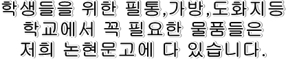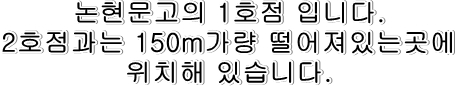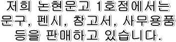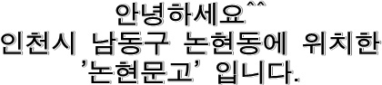 안녕하세요^^ 인천 남동구 논현동에 위치한 '논현문고' 입니다. 저희 논현문고는 150m간격으로 1호점과 2호점이 있습니다. 1호점에서는 문구,펜시,사무용품을 판매하고 2호점은 서점입니다. 많은 이용 바랍니다.